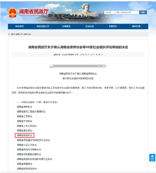 近日,湖南省民政厅发布《关于确认湖南省律师协会等88家社会组织评估等级的决定》,湖南省旅游协会再次被确认为5A级社会组织。这是继2020年首次获评后,协会再度荣膺此项荣誉,标志着协会各项工作持续保持高水平,规范化建设与创新发展持续走在全省社会组织前列。