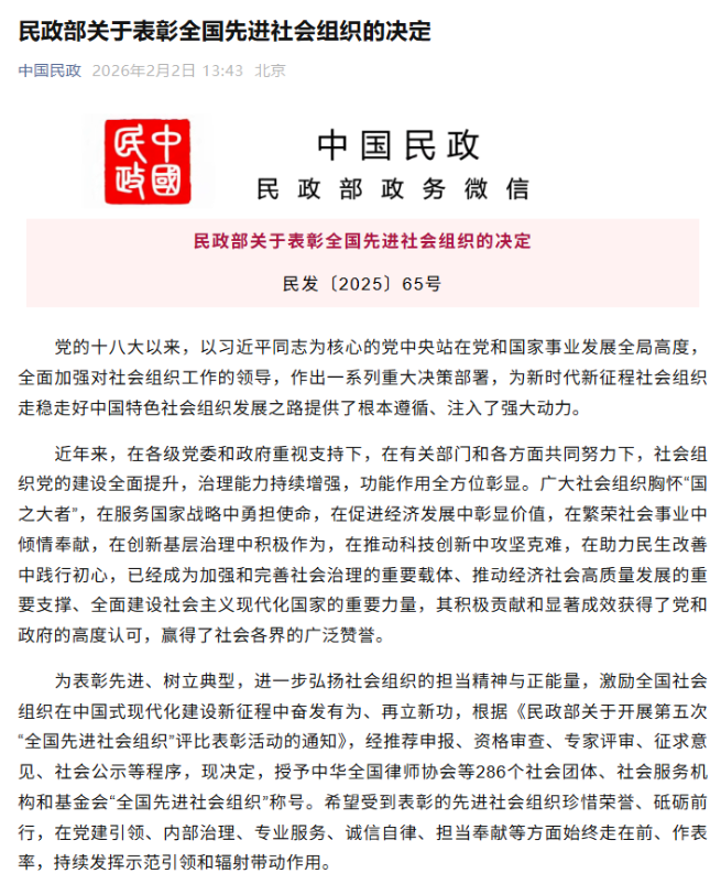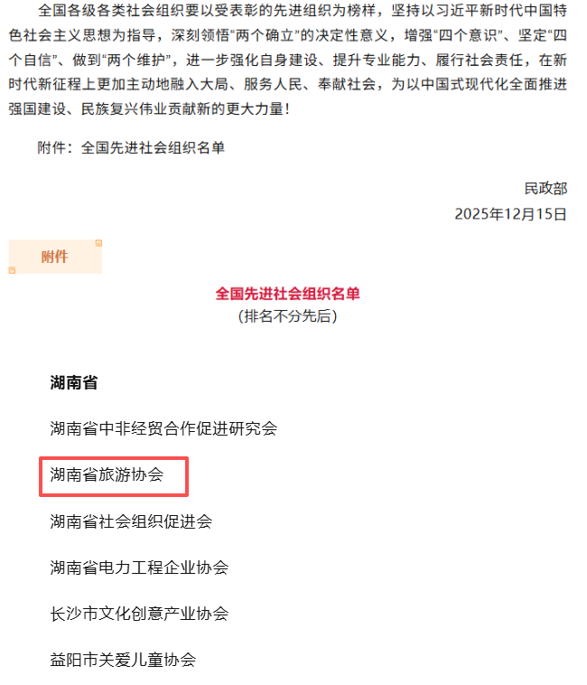 2月2日,民政部公布《民政部关于表彰全国先进社会组织的决定》,根据《民政部关于开展第五次“全国先进社会组织”评比表彰活动的通知》,经推荐申报、资格审查、专家评审、征求意见、社会公示等程序,授予全国286个社会团体、社会服务机构和基金会“全国先进社会组织”称号。湖南省旅游协会凭借在服务行业发展、推动文旅融合、强化自身建设等方面的突出表现,成功获评该荣誉,成为湖南文旅行业首次获得该称号的行业协会。
