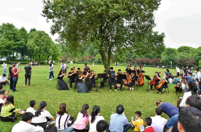 ▲5月1日,夏之恋·橘子洲假日音乐会上演,游客坐在草坪上听交响乐。